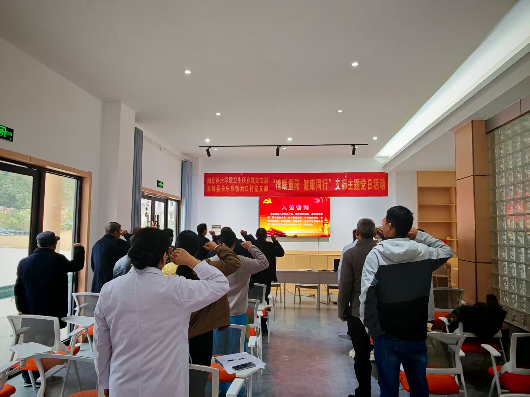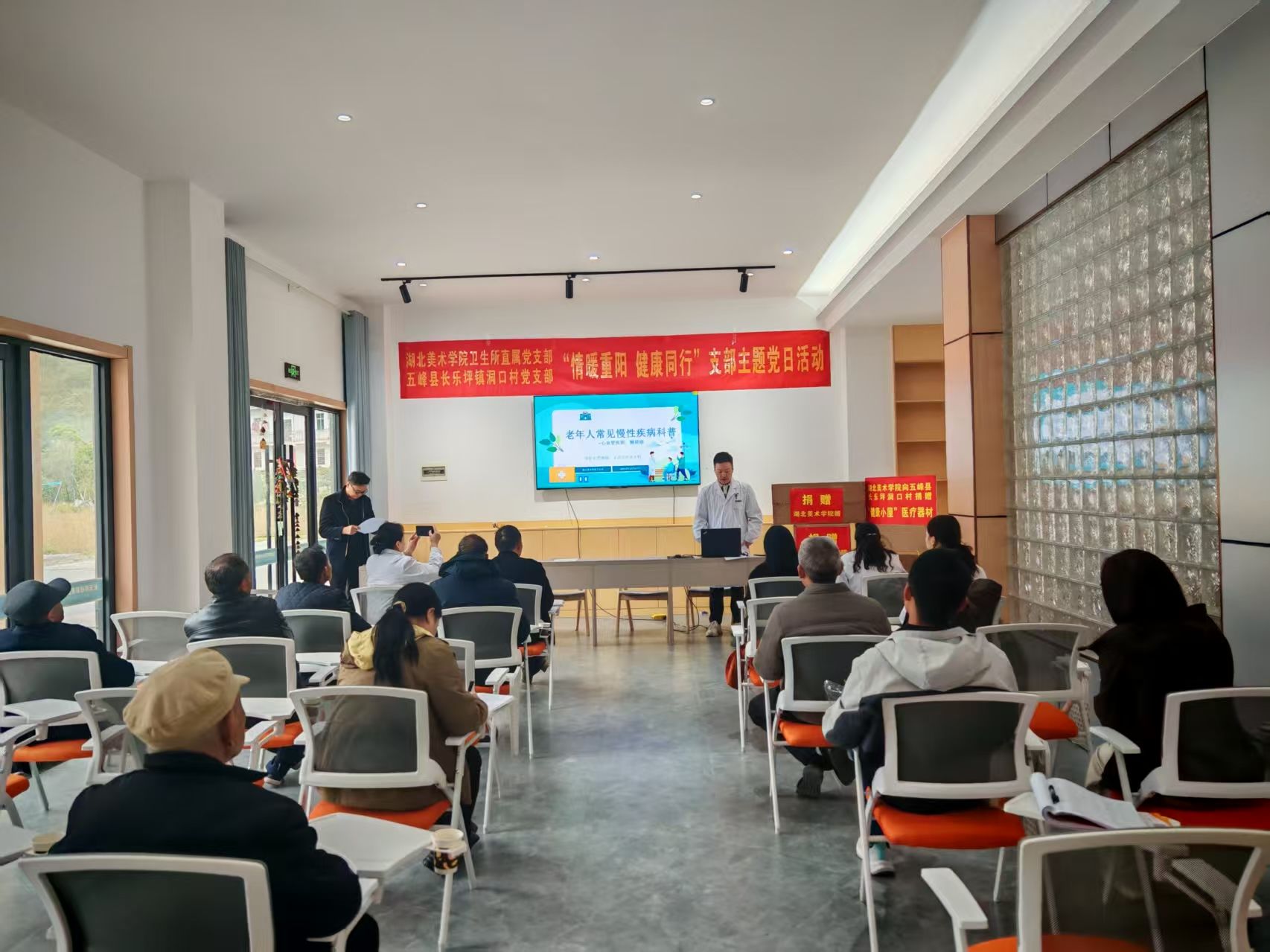 金秋送爽,丹桂飘香。10月27日上午,湖北省宜昌市五峰土家族自治县长乐坪镇洞口村新村委会大楼一楼会议室内暖意融融,湖北美术学院卫生所直属党支部与洞口村党支部联合开展的“情暖重阳健康同行”主题党日活动在此举行。镇领导、村“两委”、驻村工作队、湖北美术学院卫生所专家与老党员代表围坐一堂,一场融合物资捐赠、理论学习与健康服务的特色活动,让传统重阳佳节浸润着浓厚的党建温情。