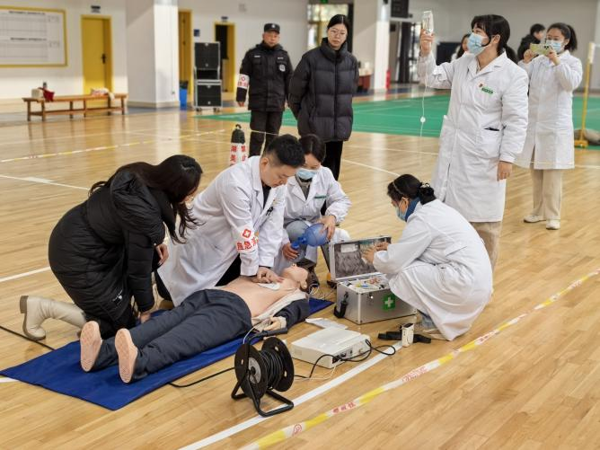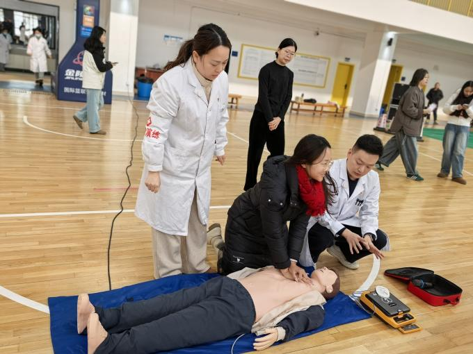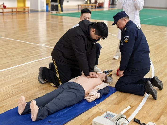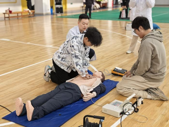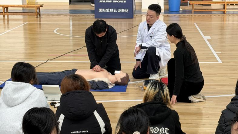 培训结束后,校卫生所联合公共课部、保卫部随即组织开展“模拟学校体育馆学生突发呼吸心脏骤停应急演练”。模拟一名学生在体育活动中突然倒地、呼吸心脏骤停,现场人员第一时间呼救、快速判断病情,迅速启动标准化急救流程,规范实施心肺复苏术,并及时取用AED进行辅助救援,各环节衔接紧密、操作规范有序。此次实战化演练,既进一步检验了师生的应急反应速度和急救技能熟练度,更让“黄金4分钟”的急救理念深入人心。