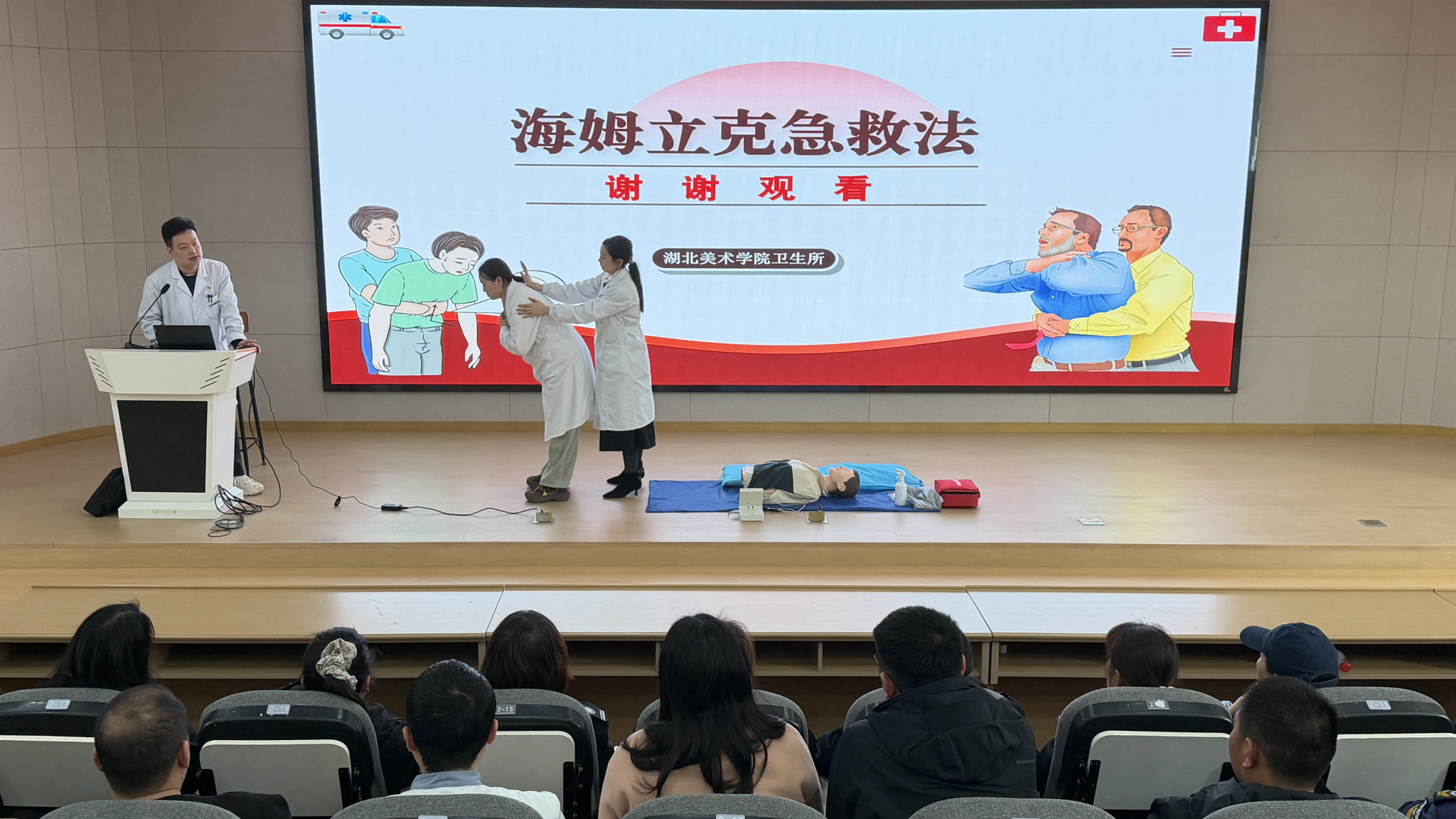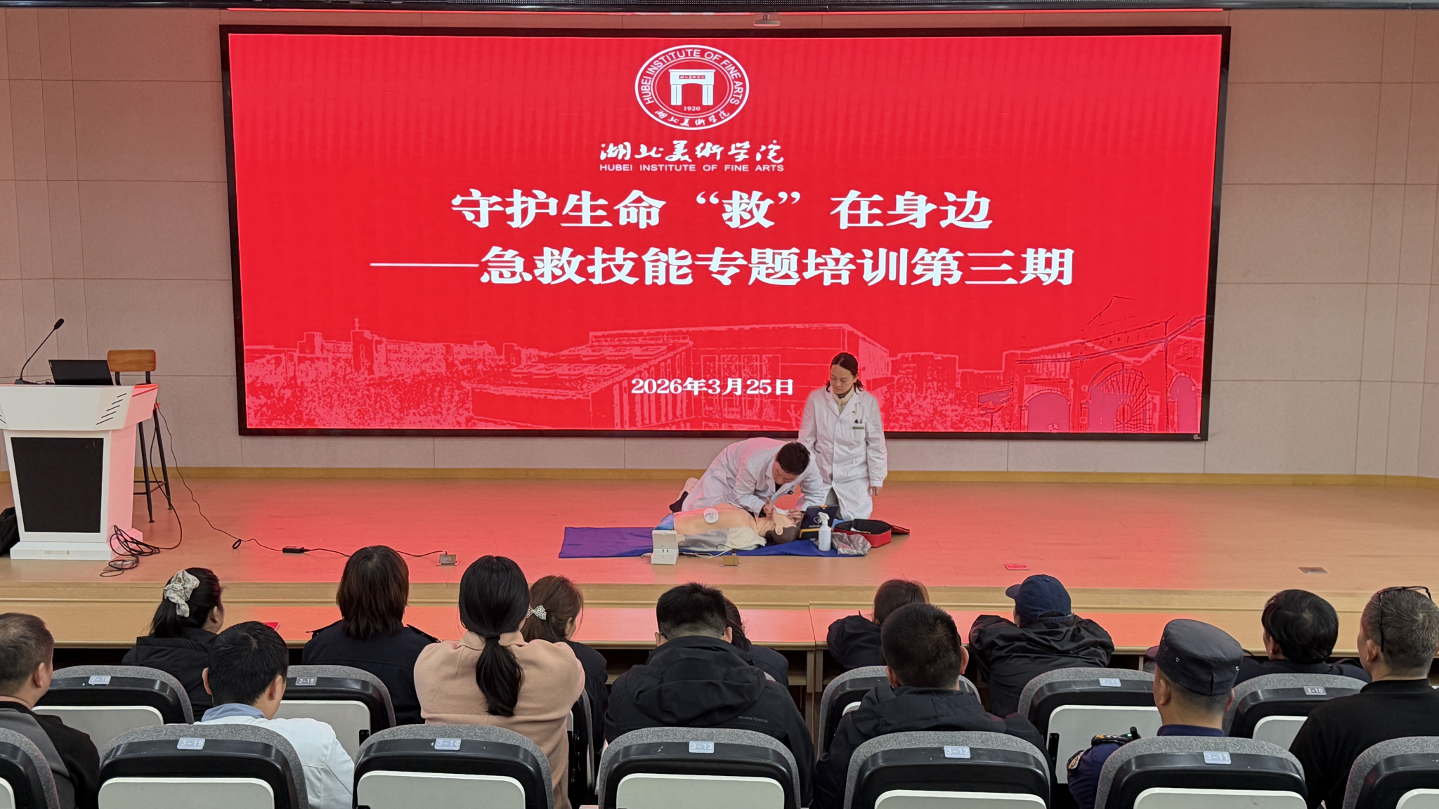 为持续深化健康校园建设,全面普及应急救护知识,切实强化后勤管理处与保卫处重点人员在突发状况下的自救互救与应急处置能力,筑牢校园安全防护屏障,3月25日,校卫生所顺利开展“守护生命‘救’在身边”急救技能专题培训(第三期)——后勤管理处与保卫处重点人员专场。本次培训针对性覆盖学校学生宿舍宿管、教学楼楼管、食堂工作人员及保安,大家积极参与、认真学习,现场学习氛围浓厚,培训效果突出。