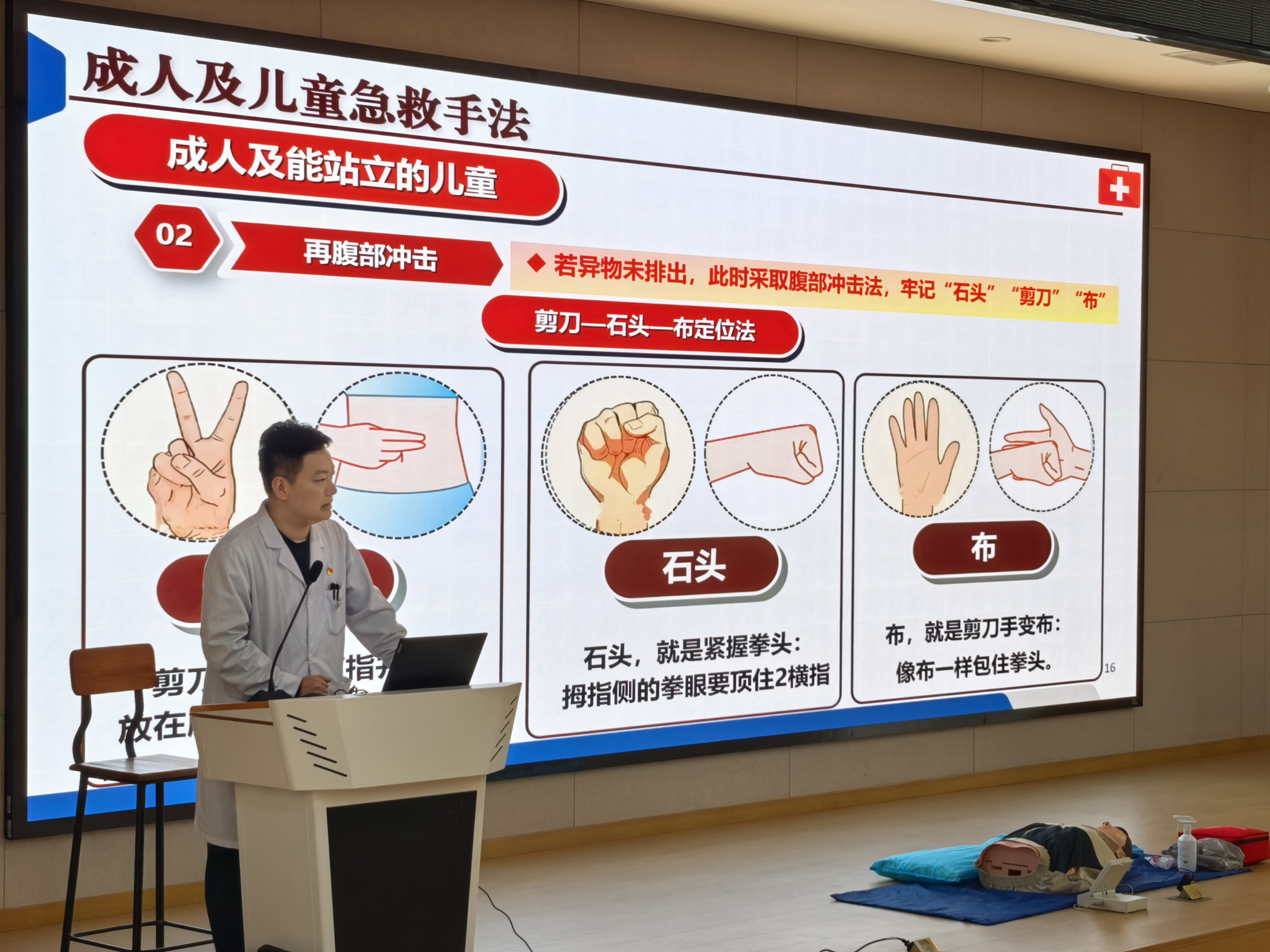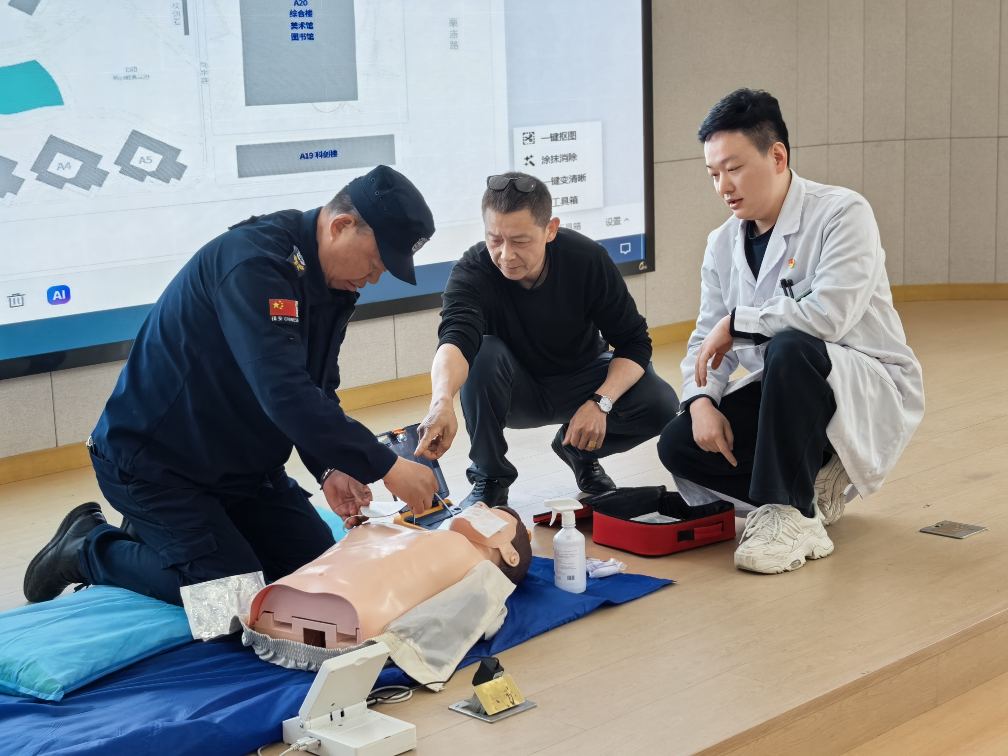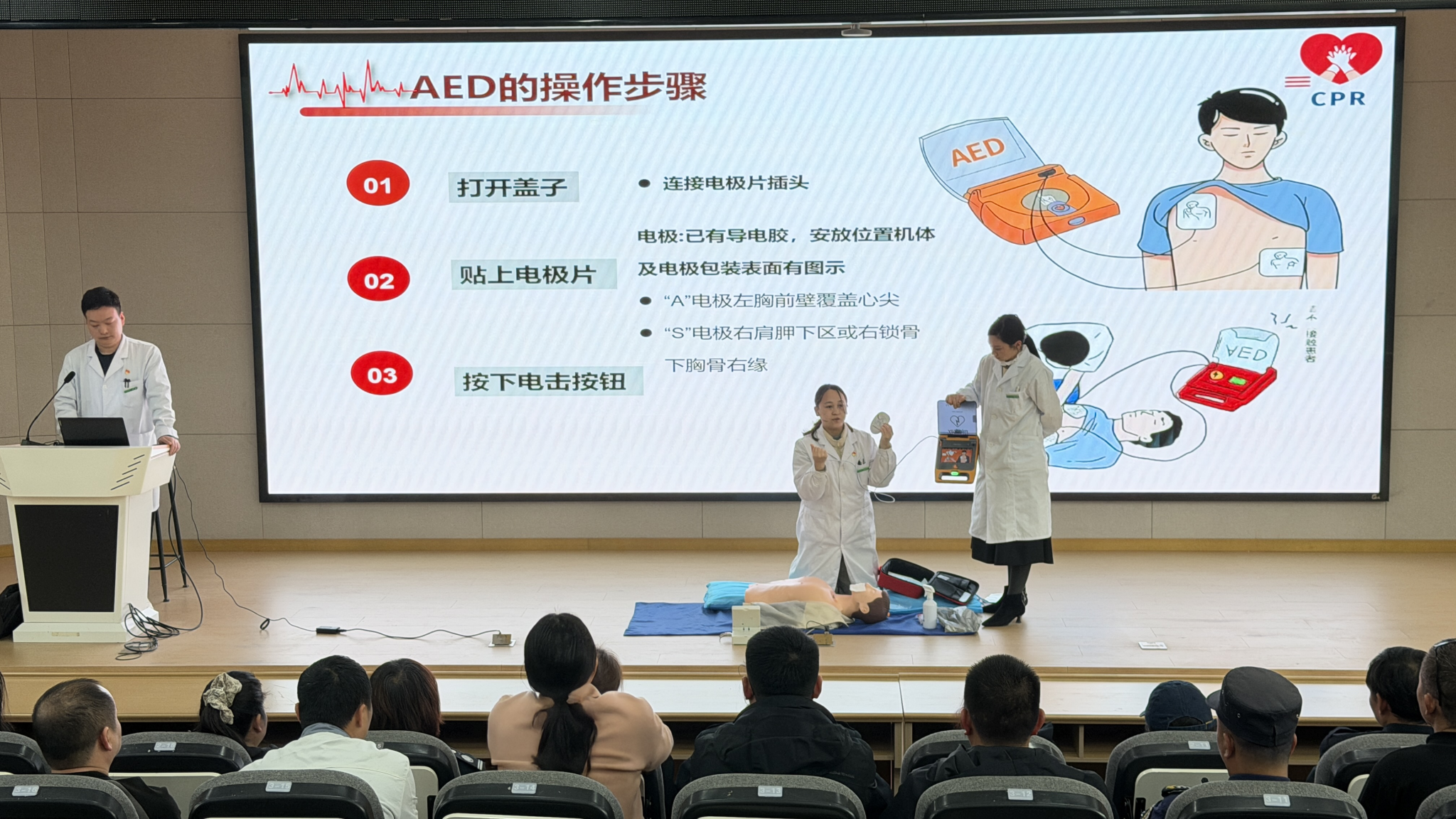 在CPR与AED的理论授课环节,徐医生系统阐释心搏骤停“黄金4分钟”的施救准则,着重强调及时、规范开展急救的关键意义。细致讲解胸外按压的精准位置、按压深度与频率、开放气道的技巧、人工呼吸的规范动作等核心技术,同时完整演示AED从开机、电极片粘贴、心律分析到放电操作的全流程规范,同步提醒操作中的禁忌事项与注意要点,引导参训人员树立科学严谨的急救理念。