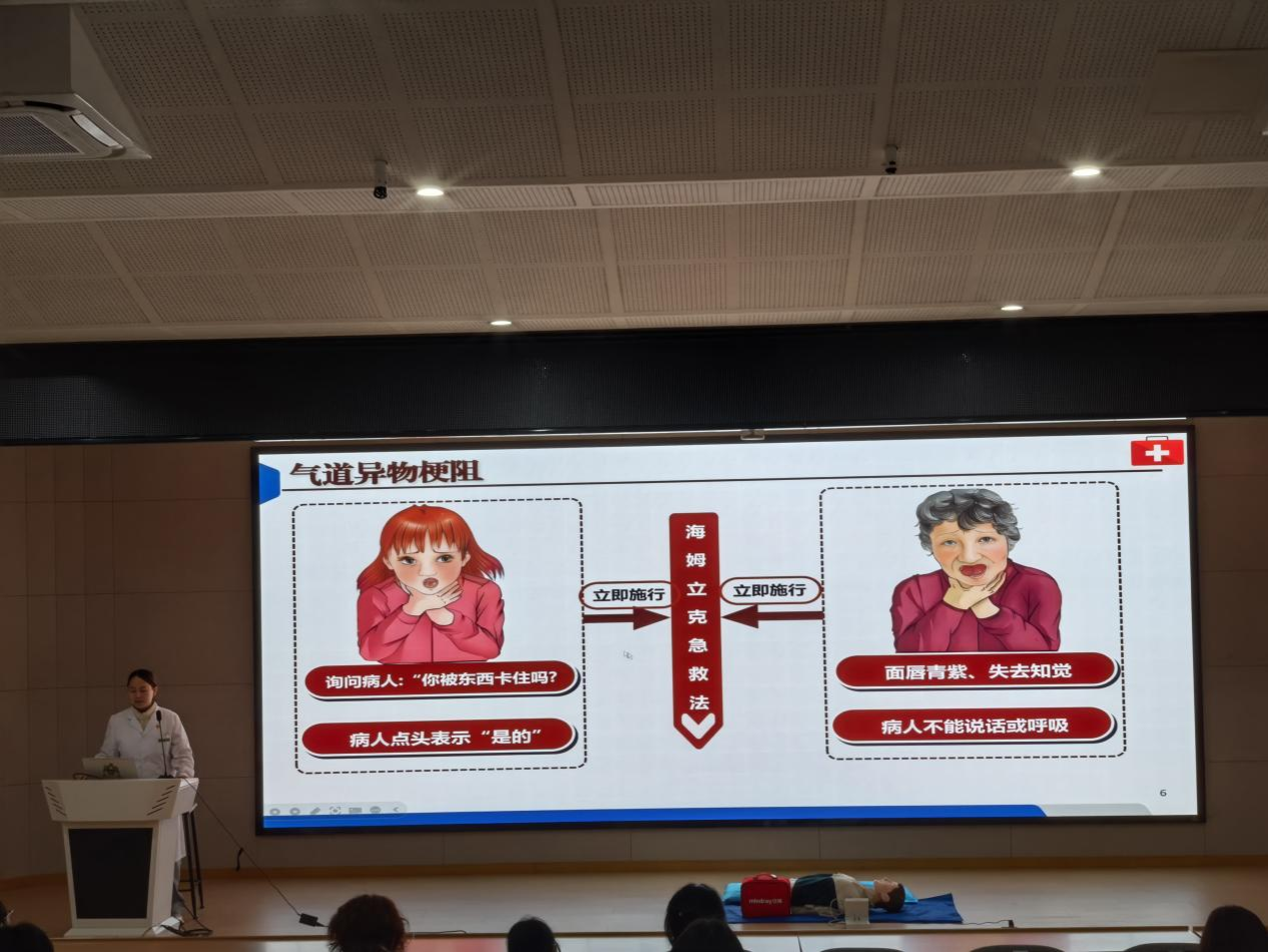 培训开始,何医生围绕海姆立克急救法展开讲解,结合气道异物梗阻的典型症状与识别要点,用通俗易懂的语言讲解施救流程与关键动作,并播放规范教学视频,让同学们直观掌握核心要领。随后,卫生所秦医生与邹科长现场配合演示,完整还原成人施救标准动作,清晰展示发力部位、冲击方向与操作节奏,将理论知识转化为直观示范,加深大家理解与记忆。