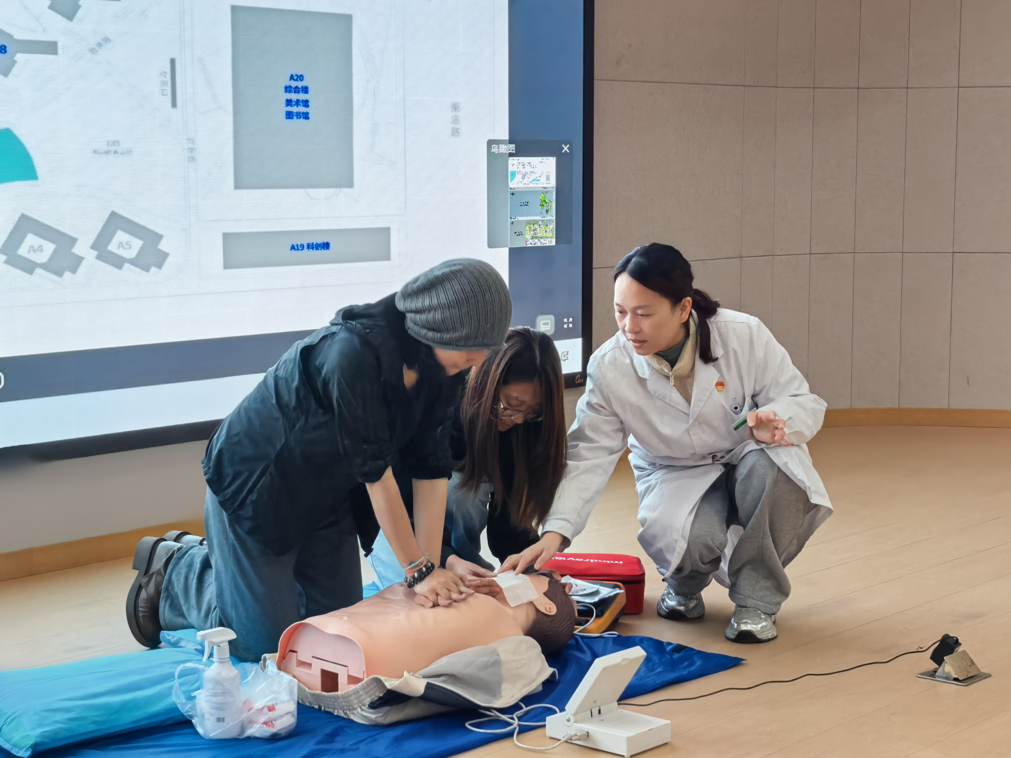 紧接着,何医生系统讲解心肺复苏(CPR)与自动体外除颤器(AED)知识,重点强调心搏骤停 “黄金 4 分钟” 的重要性,详细说明胸外按压位置、深度、频率及开放气道、人工呼吸等关键步骤。培训中播放 AED 使用教学视频,并通过 PPT 展示校内 AED 分布点位图,让同学们清楚知晓校园急救设备位置,提升应急响应效率。